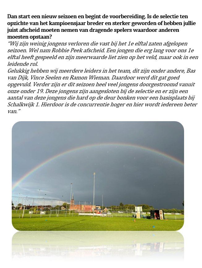 Inmiddels is hij een vaste waarde binnen het team van Schalkwijk. Nog jong, maar nu al een onmisbare schakel in de ploeg. Ook wij komen zijn naam regelmatig tegen in reacties en wedstrijdverslagen.