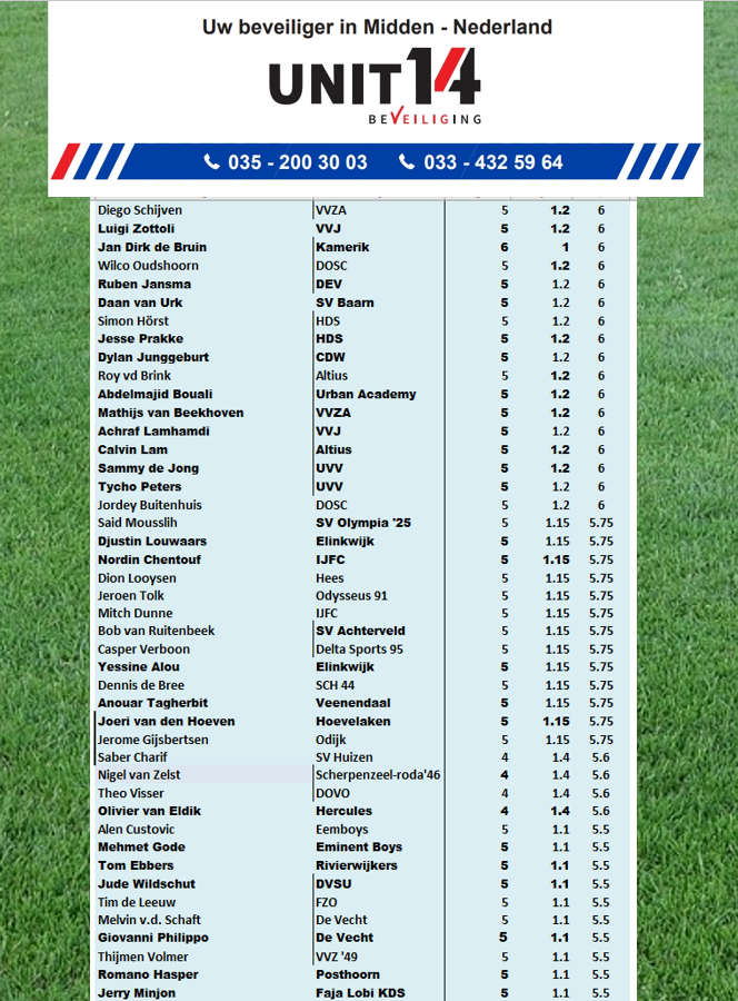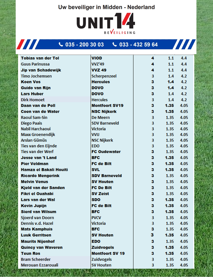 Das Phantom maakte er 2 maar de wedstrijd moet nog uitgespeeld worden, ze zijn nog niet verwerkt in de stand dus...... Echter is het spel nu echt op de platte kar. Sercan, Gokhan en Tim met in de achtervolgende groep Quinten, Mo en Lennart. Het lijkt Parijs-Robaix wel van afgelopen weekend. Wie gaat er met de gouden bokaal vandoor als topscorer van het seizoen!! Wat is het spannend! Oja we hebben ons beperkt t/m factor 4 qua goals.